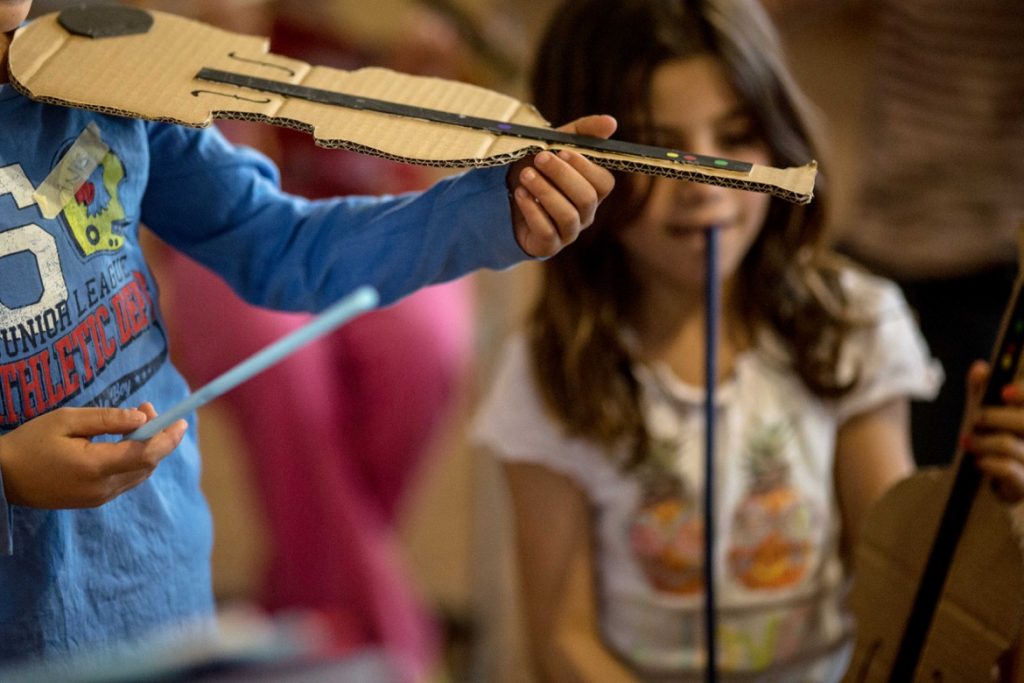 Die Faszination für die Streichinstrumente war groß. In den ersten Proben übten wir mit selbstgebauten Papp-Geigen die grundlegenden Bewegungen des Streichens. Nach einigen Wochen konnten die Papp-Geigen durch echte Instrumente ersetzt werden.