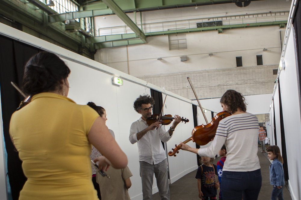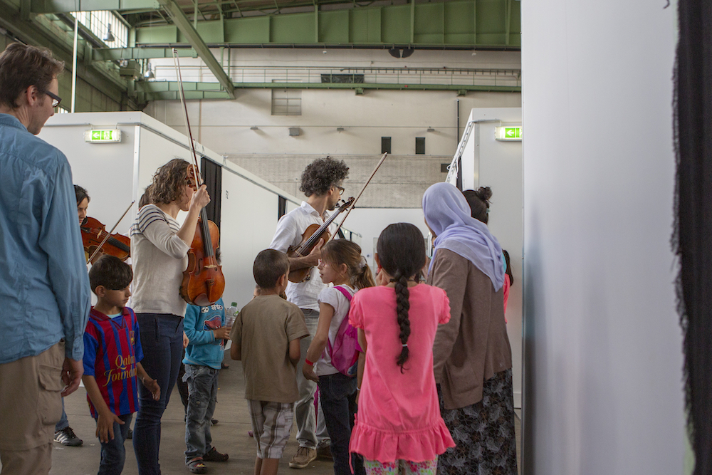 Auf seinen Instrumenten spielend zog das Team von Hangarmusik regelmäßig durch Hangar 7, um die Kinder auf das Projekt aufmerksam zu machen. Anschließend versammelten wir uns im Kinderbetreuungsraum, der zu unserem ersten Probenort wu