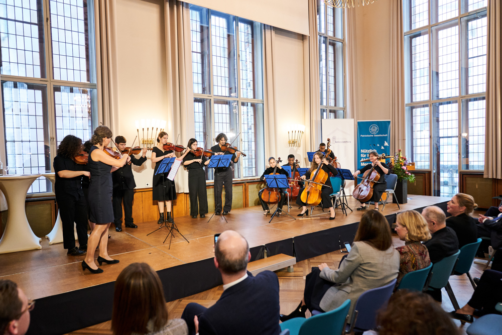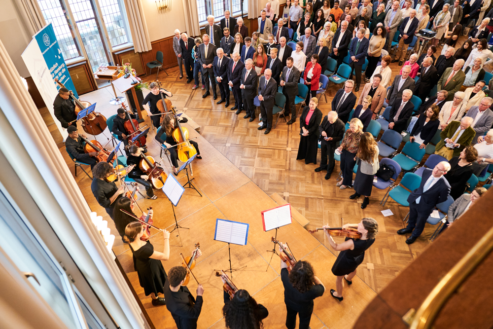 Hangarmusik trat mit zwei musikalischen Beiträgen auf. Den feierlichen Abschluss bildete die „Ode an die Freude“ von Ludwig van Beethoven. Zum Finale sangen alle Gäste im Saal stehend gemeinsam mit, ein bewegender Moment für das Publikum und die jungen Musikerinnen.