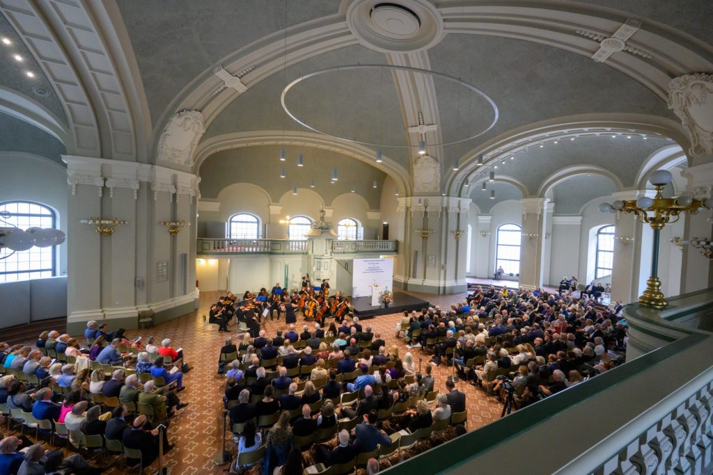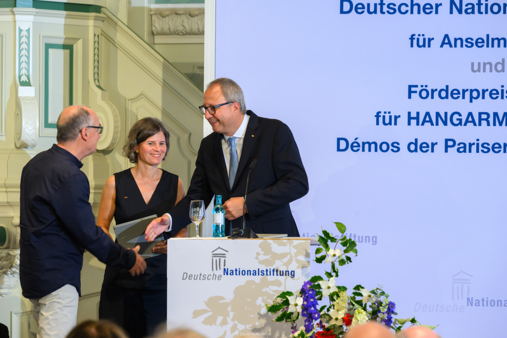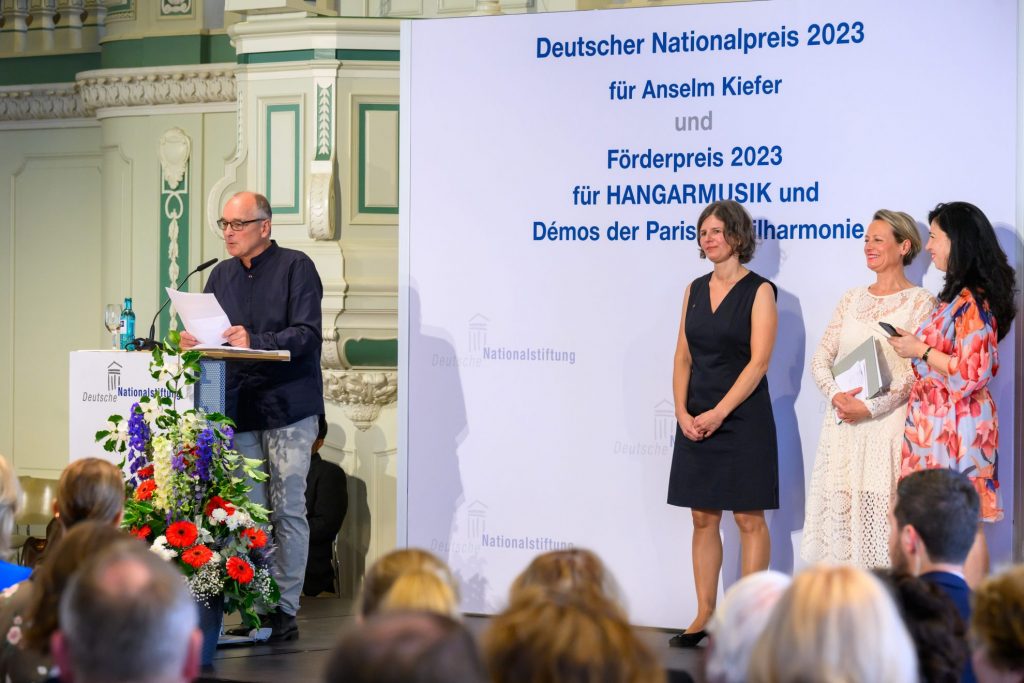 Aus den Händen des ehemaligen Präsidenten des Bundesverfassungsgerichts und Senatsvorsitzenden der Deutschen Nationalstiftung Prof. Dr. Andreas Voßkuhle erhielten Leila Weber und Andreas Knapp am 6. Juli 2023 für Hangarmusik den Förderpreis der Deutschen Nationalstiftung 2023.