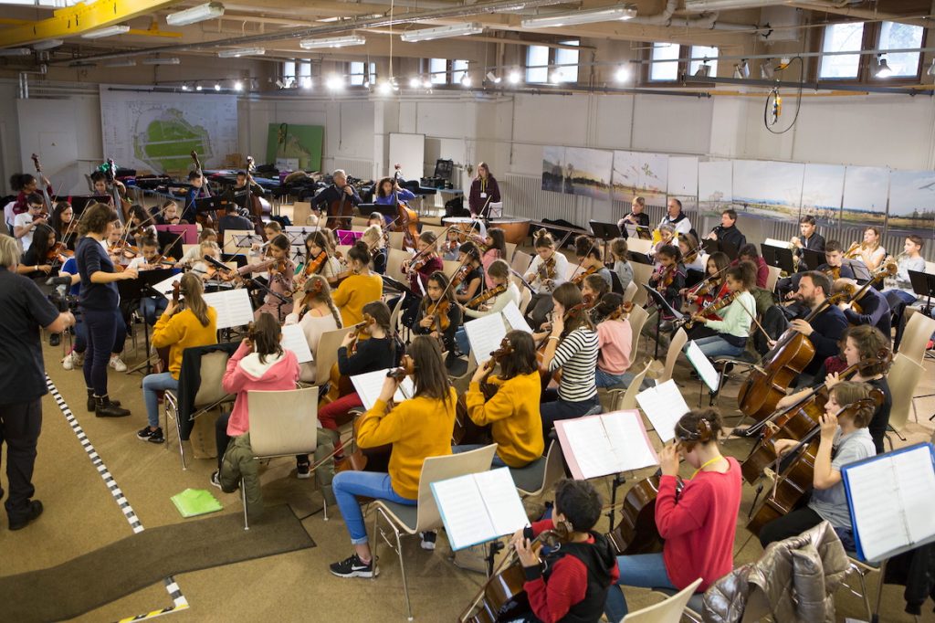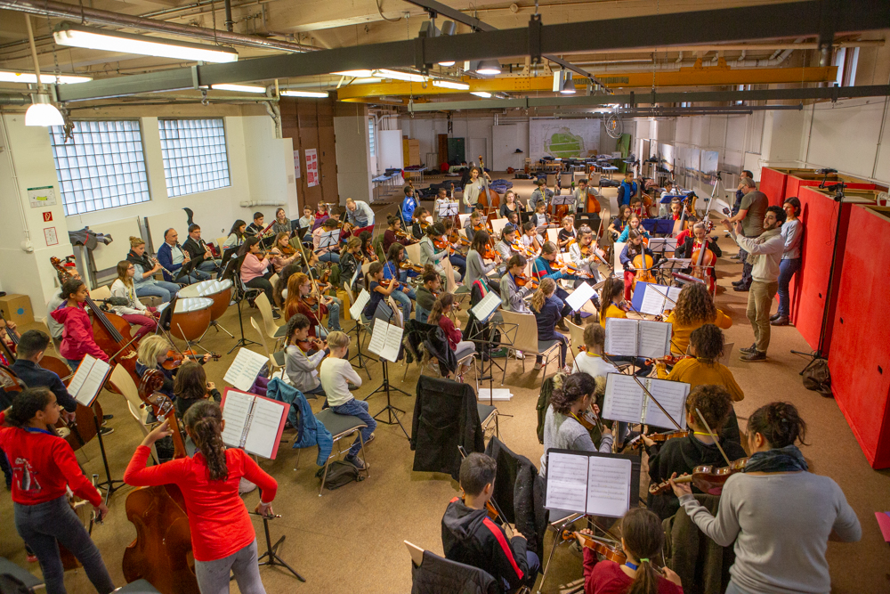 Bei der Abschlussprobe wirkte das Publikum als Chor mit. Gemeinsam mit den Kindern musizierten sie die „Ode an die Freude“ aus Beethovens 9. Sinfonie.