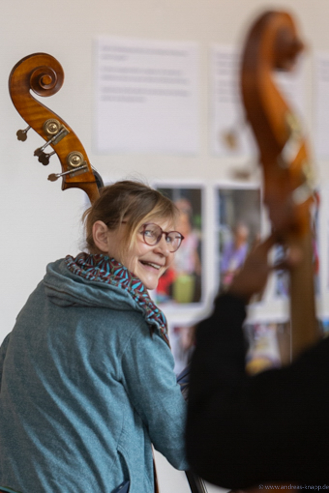 Angela Brunton-Trüg (Kontrabass) ist Orchestermusikerin und Gestalttherapeutin. Sie war beim NDR-Symphonieorchester, dem Schleswig- Holsteinischen Landestheater und der Komischen Oper unter Vertrag. Seit 2013 ist sie freischaffende Musikerin und spielt im in und Ausland. Parallel zu ihrer beruflichen Tätigkeit als Musikerin und Musikpädagogin, betreibt sie eine eigene Praxis für Gestalttherapie mit traumatherapeutischem Fokus (HeilprGPsych.) und ist Mitglied bei der Gesellschaft für Psychotraumatologie und Gewaltforschung (GPTG). Für Angela ist das Besondere an der Arbeit mit Hangarmusik, zu erleben, wie das gemeinsame Musizieren ohne Leistungsdruck, heilsam und stabilisierend auf allen Ebenen wirkt. Da alle Beteiligten mit den Fähigkeiten, die sie im jeweiligen Moment mitbringen, willkommen sind, tragen alle dazu bei, dass sowohl immer wieder sehr besondere musikalische Momente entstehen als auch eine wohlwollende Gemeinschaft.